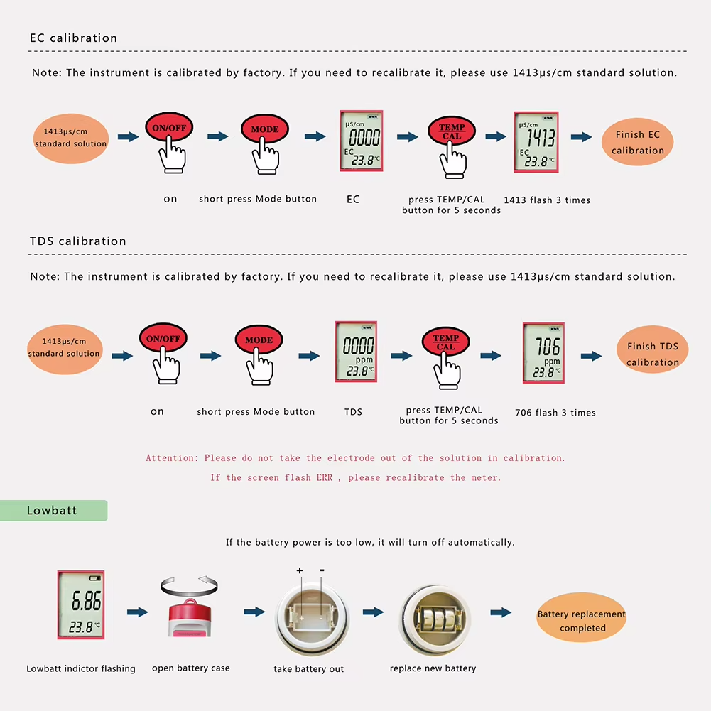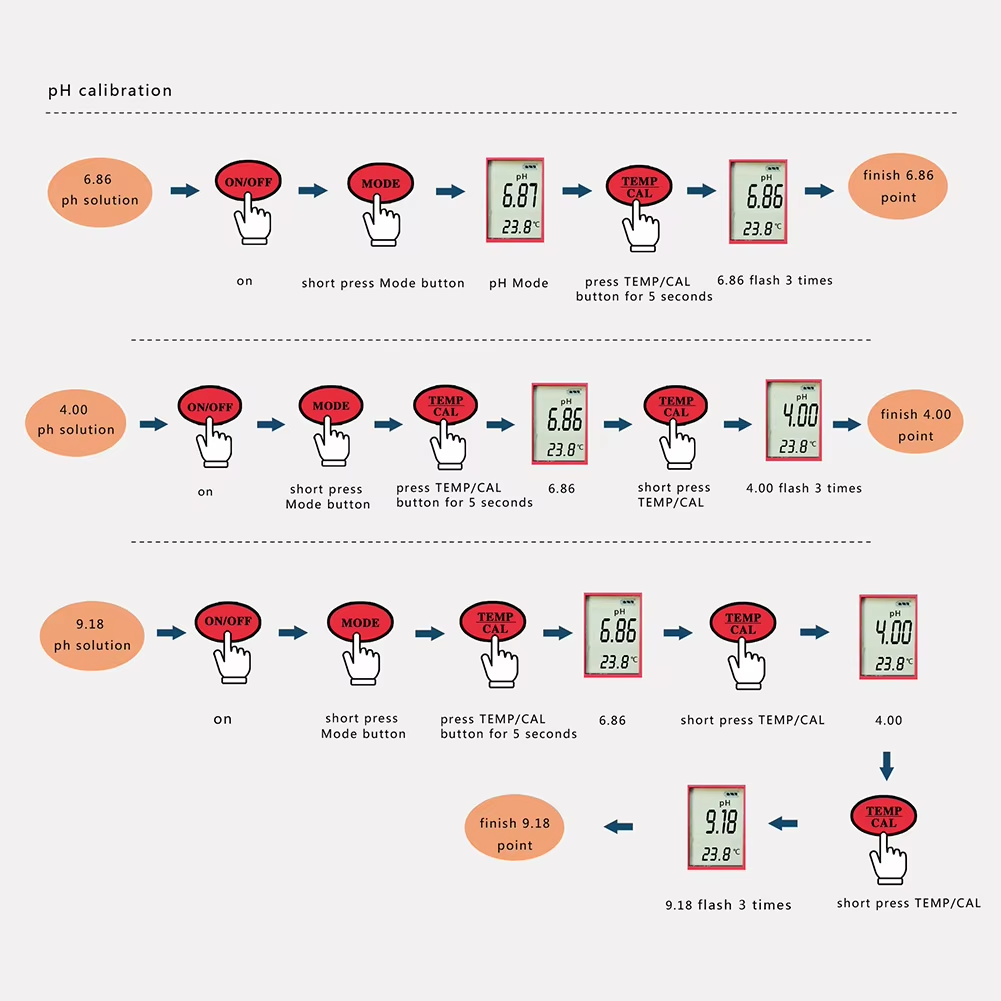 To calibrate your pH Meter, please follow the steps below. 1. Before calibration, add the pH4.00/pH6.86/pH9.18 buffer powder to the beaker with 250ml of distilled water, then stir until the powder is completely dissolved. 2. Place the electrode into the pH4.00/pH6.86/pH9.18 standard solution and wait for the reading to stabilize (usually 510 seconds); 3. Press and hold the MODE/CAL button and release after 6 seconds; Wait until the pH4.00/PH6.86/PH9.18 reading stops flashing.