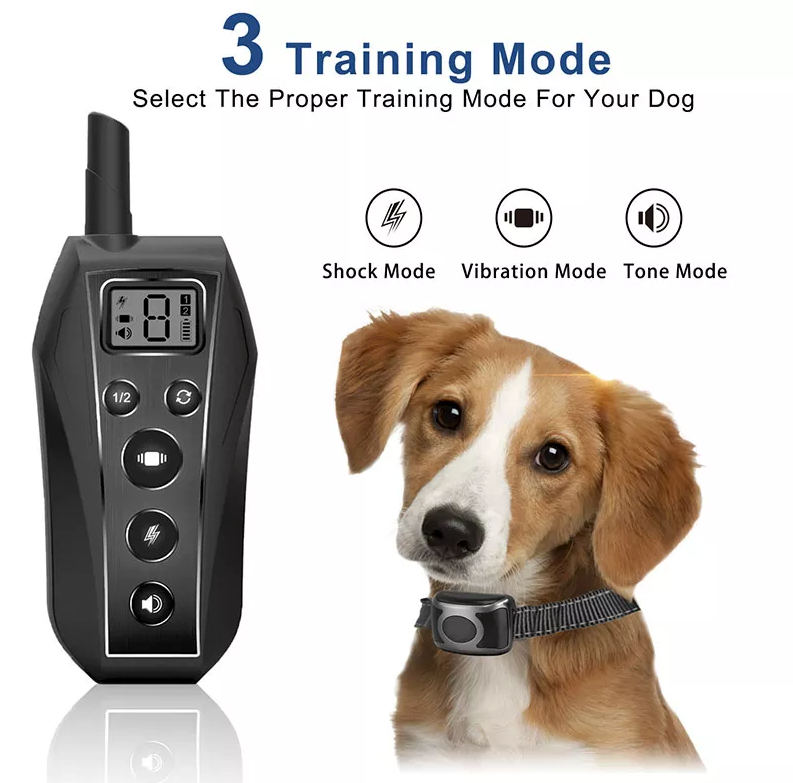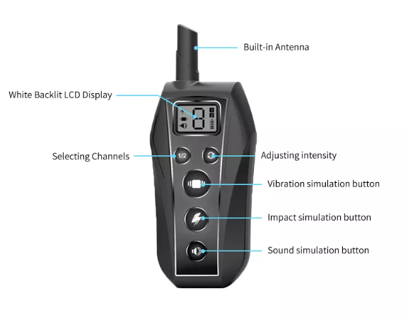 Select between 3 Training Modes and 1-8 intensities for each. From Shock mode, Vibration mode, and Tone Mode. We always recommend to use Vibration and Tone(sound) mode first before using Shock Mode.