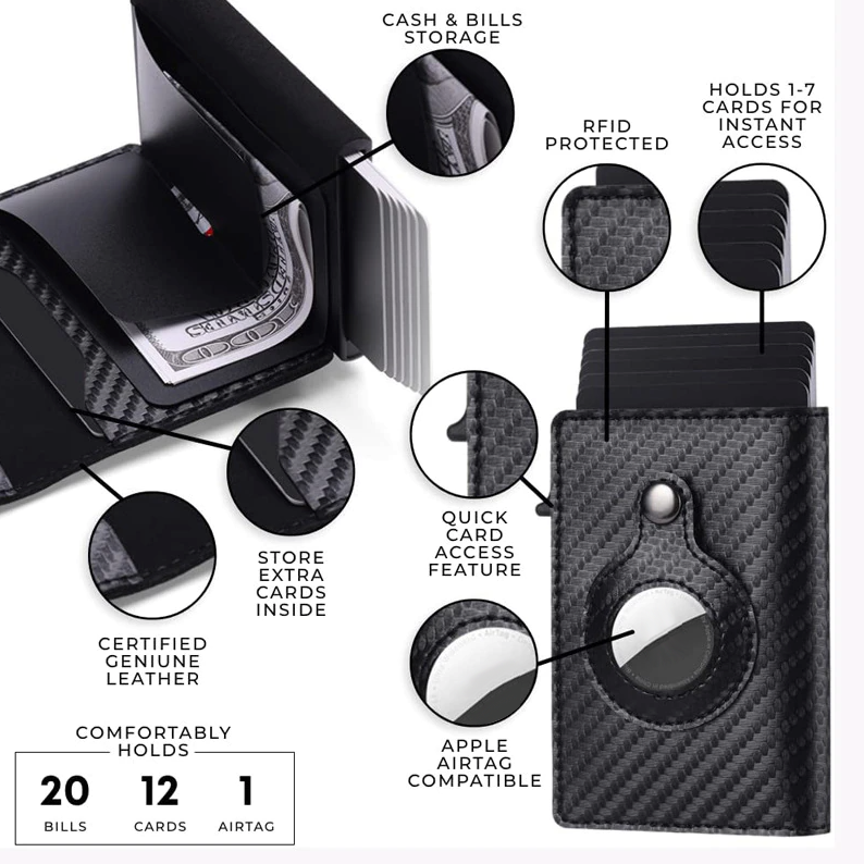 - ⚜️ Feature Rich Design: This genuine leather For air tag wallet is a unique combination of luxury, style and functionality; Seamlessly pop-out up to 6 cards in a tiered fashion using a smooth slider on side, Unfold to reveal a snug-fit money and other compartments for cards and bills; You would love to flaunt it, making a strong style statement of your own