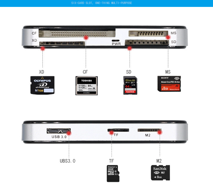 • Supports: Micro SD, SD, XS, CF, M2, MS, TF