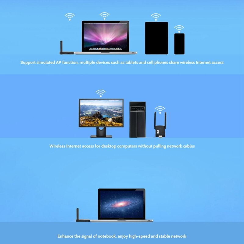 Dual BandUSB Computer Network Adapters with Dual 5dBi High-gain antennas greatly enhances the reception and transmission signal strength.180° rotatable antenna provides a stronger wireless transmission and receives signals from any angle.