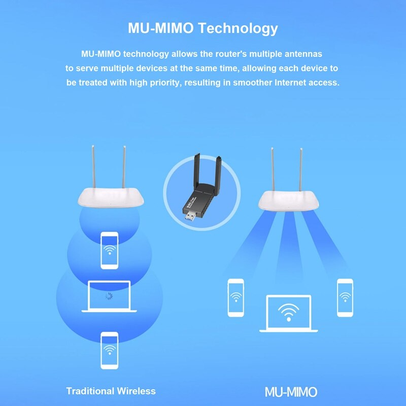The WiFi Adapter is equipped with high-gain dual 5dBi antennas and uses MU-MIMO technology to provide two simultaneous data streams. with a compatible MU-MIMO router, It can significantly increase the total network throughput and capacity, MU-MIMO technology boosts connection speed when multiple compatible clients are online.