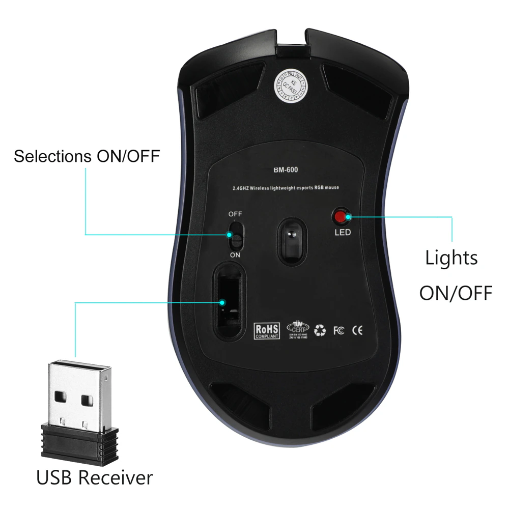 This wireless rechargeable mouse can provide 5 kinds of chroma backlight to meet your different style of game needs.You can change the backlight mode through the light adjustment button at the bottom. And also you can turn the power off by adjusting the bottom to the position of “Off” and “ON”.