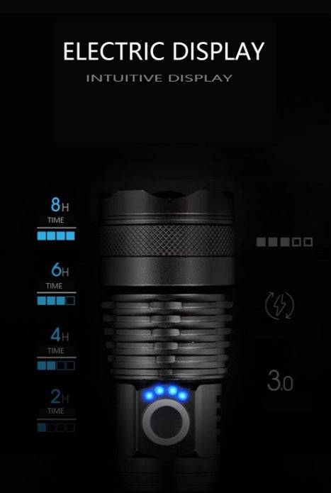 - Battery capacity display, telescopic zoom Micro USB for USB computer, USB for car, USB charging plug, charging flashlight.